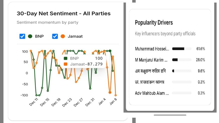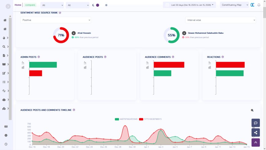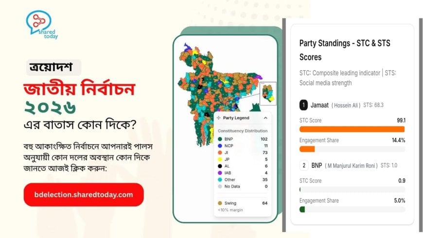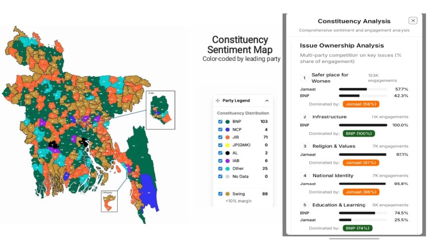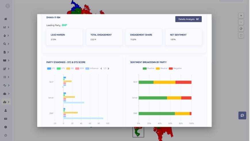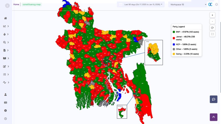 নির্বাচন মানেই হিসাব-নিকাশ, জল্পনা-কল্পনা আর শেষ মুহূর্তের নাটক। কিন্তু যদি এই সবকিছুকে অনুমানের বদলে ডেটা ও বিশ্লেষণের আলোয় দেখা যায়? ঠিক এই প্রশ্নের উত্তর দিতেই বাংলাদেশের নির্বাচনী প্রেক্ষাপটে আলোচনায় এসেছে সোশিয়ান এআই (Socian AI)–এর নতুন উদ্যোগ ‘ইলেকশন বাজ’। এটি মূলত একটি ইন্টারেক্টিভ অ্যানালিটিক্স ড্যাশবোর্ড। এখানে প্রতিটি আসনে কোন প্রার্থী বা দল এগিয়ে, কোথায় লড়াই সমানে সমান, আবার কোথায় জনমত দ্রুত বদলাচ্ছে—এসব তথ্য তুলে ধরা হয় বাস্তব সময়ের ডেটা বিশ্লেষণের মাধ্যমে। এই ডিজিটাল প্ল্যাটফর্মটিতে রয়েছে শতাধিক ফিচার। ইন্টারঅ্যাক্টিভ মানচিত্রে এক নজরে প্রকাশ প্রতিটি সংসদীয় আসনের নির্বাচনী পরিস্থিতি। এখানে প্রতিধ্বনিত হচ্ছে প্রার্থী ও দলের সোশ্যাল ইম্প্যাক্ট স্কোর।