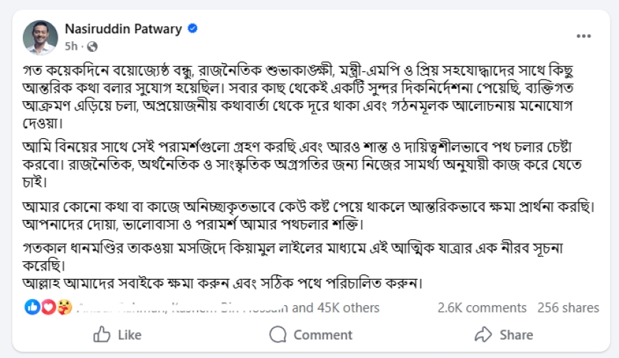 In the post, Nasiruddin Patwari wrote that over the past few days he had the opportunity to have sincere discussions with senior colleagues, political well-wishers, ministers, MPs, and close associates. He said he received consistent guidance from all—to avoid personal attacks, stay away from unnecessary remarks, and focus on constructive dialogue.