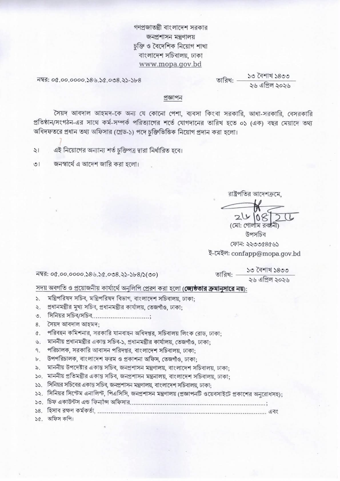 এতে আরও জানানো হয়, এই নিয়োগের অন্যান্য শর্ত চুক্তিপত্রের মাধ্যমে নির্ধারিত হবে। জনস্বার্থে এই আদেশ জারি করা হয়েছে।